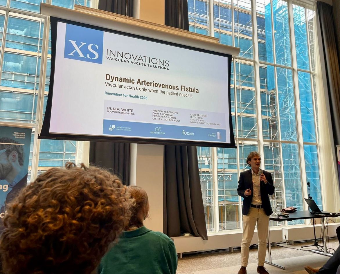 Nick White, CTO XS Innovations, pitching the Dynamic AVF at Innovation for Health on behalf of LUMC and TU Delft.